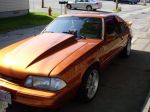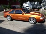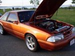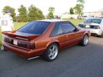 car started as an 89 4 cylinder automatic hatchback. then the work started, dss 306 block, trick flow twisted wedge aluminum heads. cobra intake with 70mm bbk tb,bbk cold air, msd 6al, f cam, 30lb. injectors,c&l mass air, tremmec tko 5 speed tranny, pro 5.0 shifter, 373 gears, full stainless exhaust off road h pipe, dynomax mufflers, 17'' silver cobra r's, bbk subframe connectors, lowered suspension, custom copper paint, 4'' cowl hood, autometer gauges, battery relocated to hatch, clear corners, gt tails, saleen wing